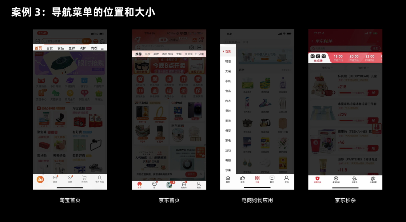 導(dǎo)航是用戶高頻操作的模塊,它的位置和大小直接影響瀏覽效率。菲茲定律在這里的應(yīng)用重點(diǎn)是 “縮短距離”—— 把導(dǎo)航放在用戶手指或視線最容易到達(dá)的地方。