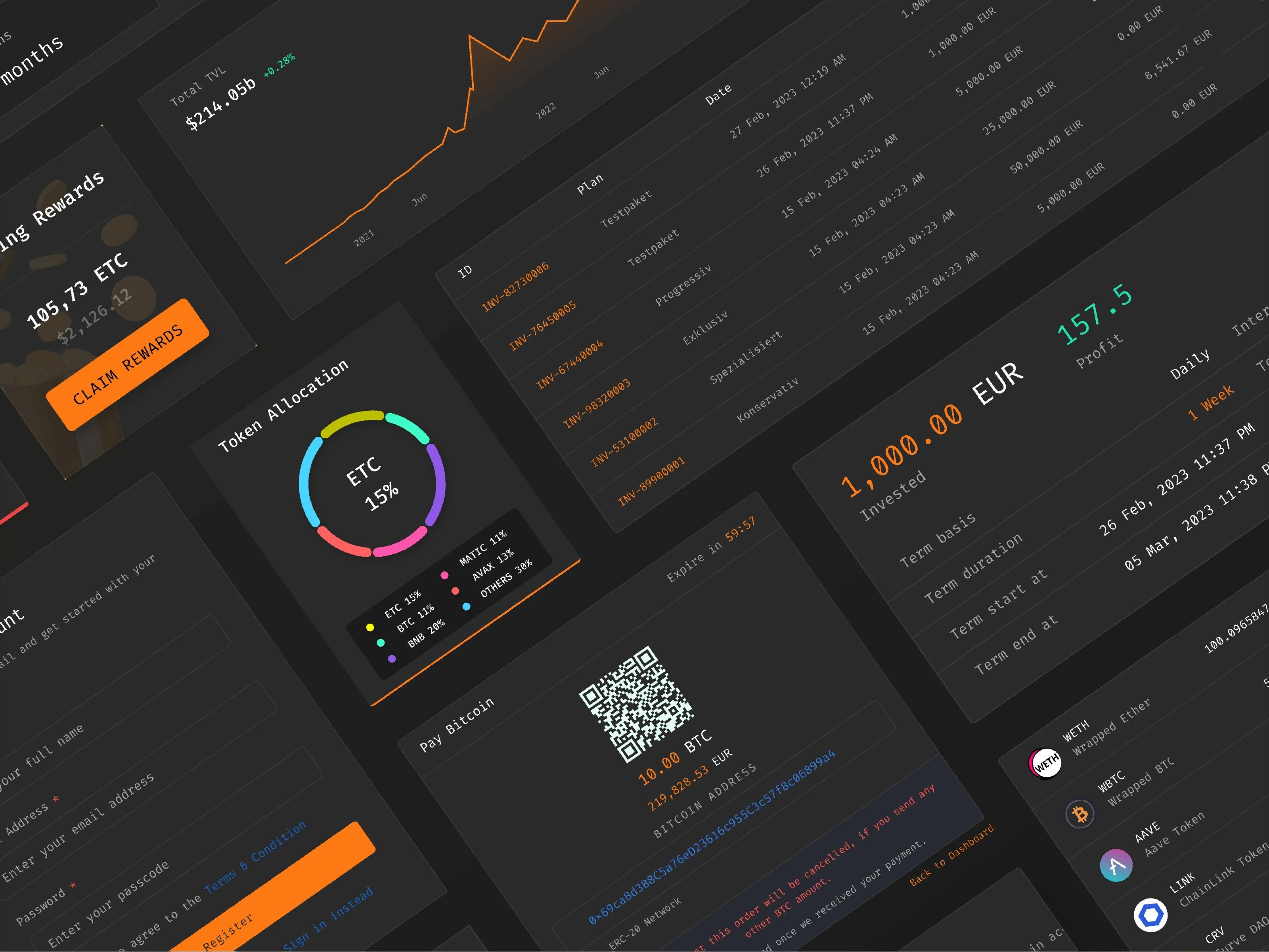 功能邏輯:聚焦 “投資全流程管理”,從資產充值、投資計劃、收益跟蹤到資產配置,全鏈路覆蓋;通過圖表(折線圖、環形圖)、數據卡片直觀呈現投資收益、資產波動、代幣占比等關鍵信息,助力用戶快速決策。
