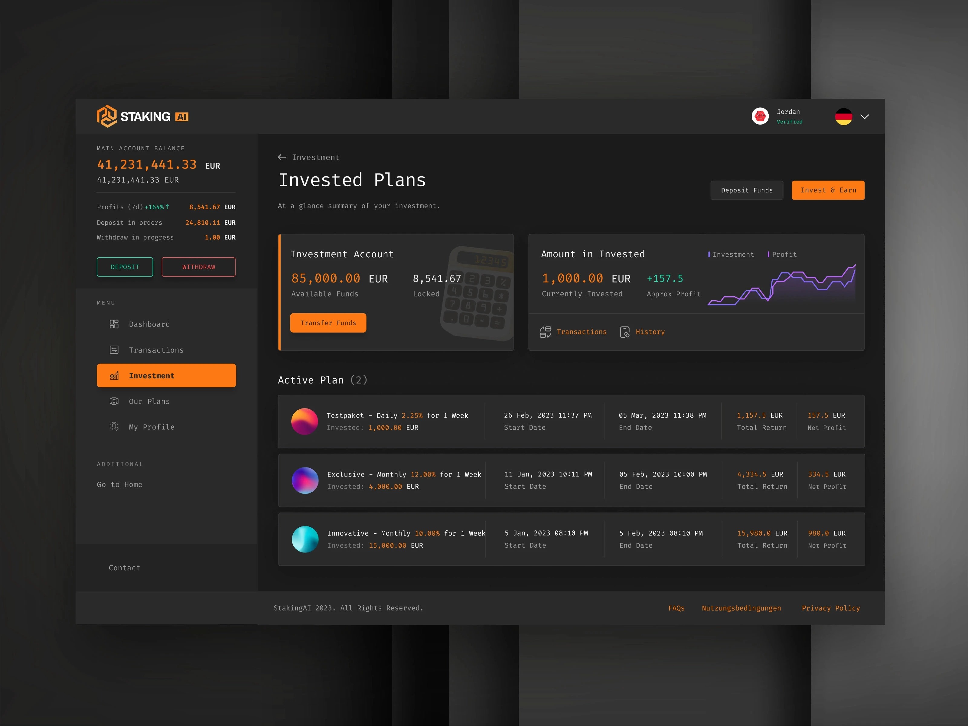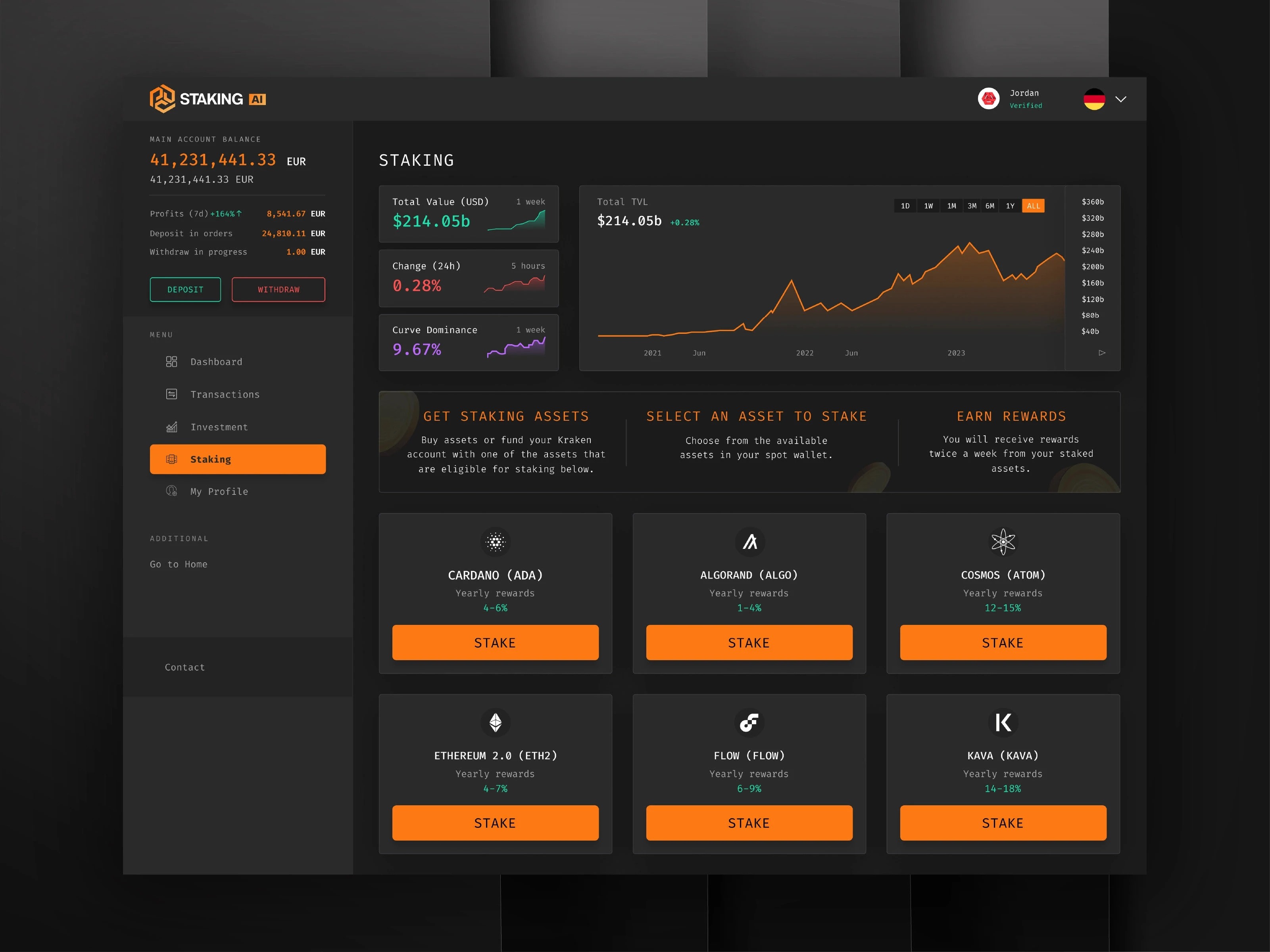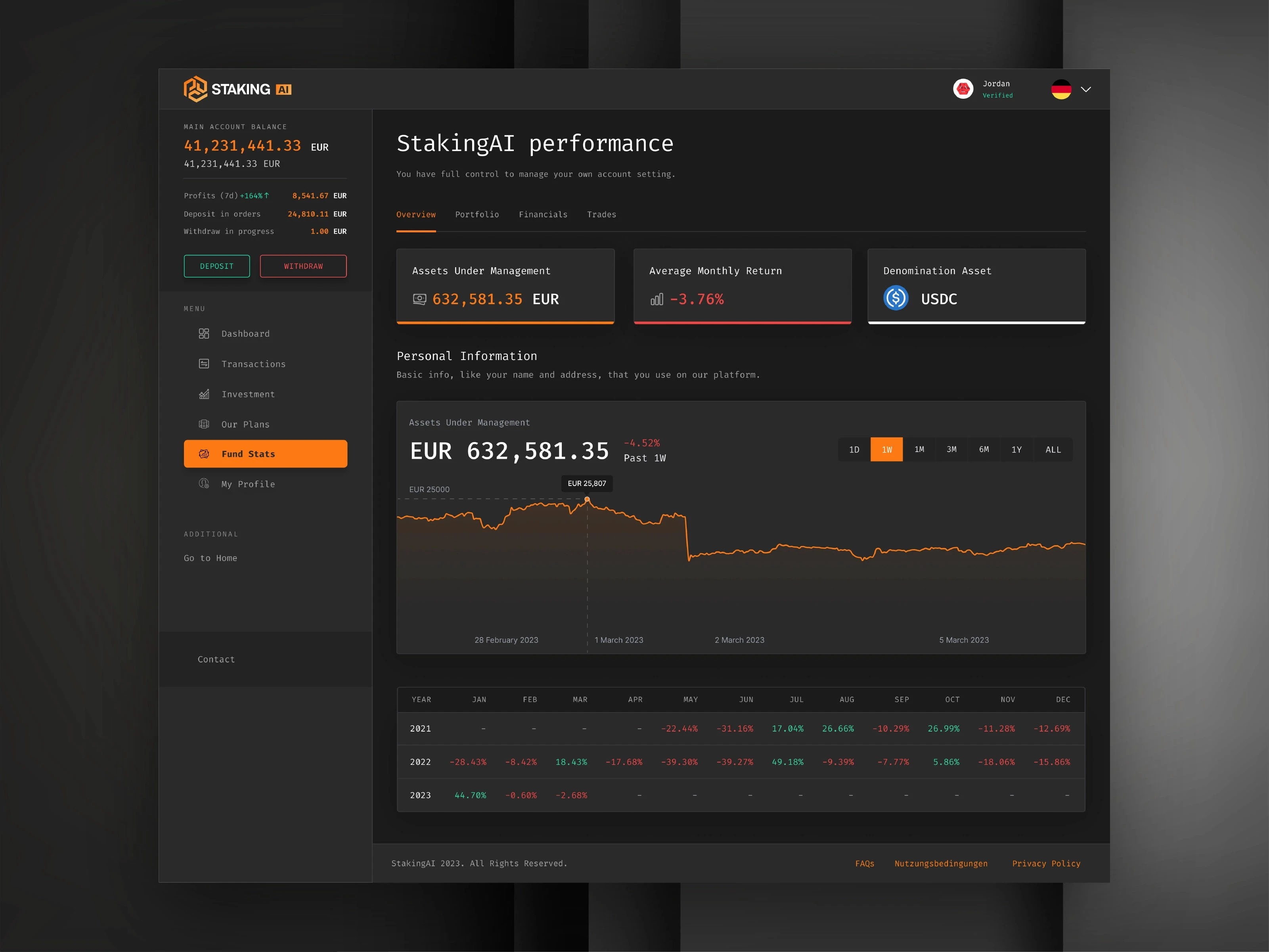 行業適配性:這種設計高度契合加密貨幣、金融投資類平臺的屬性,既通過深色風格傳遞 “穩重、可信” 的品牌形象,又以精準的數據可視化和清晰的操作路徑,滿足投資者對 “資產透明化、操作便捷化” 的核心需求,是金融科技領域界面設計的優質范例。
