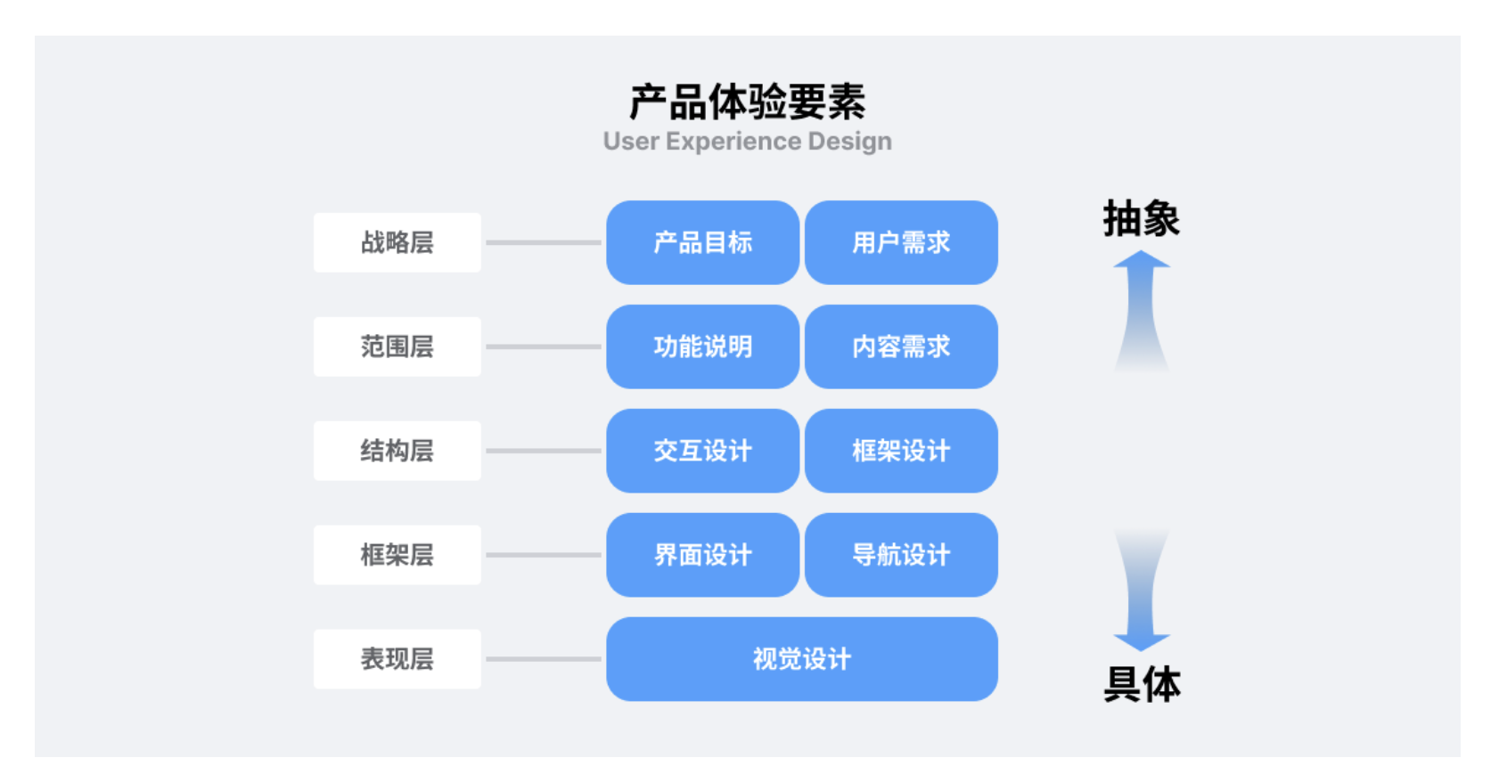 要理解它的核心,繞不開經(jīng)典的產(chǎn)品體驗五層級模型。這五個層級從抽象到具體,像搭建一座房子一樣層層遞進,少了任何一層,體驗都會 “塌掉”: