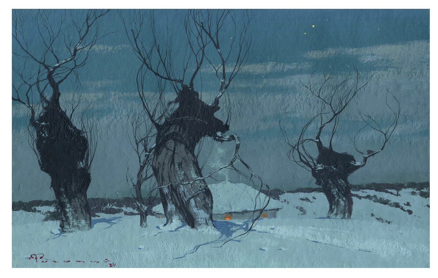Artem Rohovyi 的創作核心,是對冬日枯樹的深度描摹。在他筆下,枯樹不再是生命凋零的象征,而是冬日浪漫的 “骨架”。