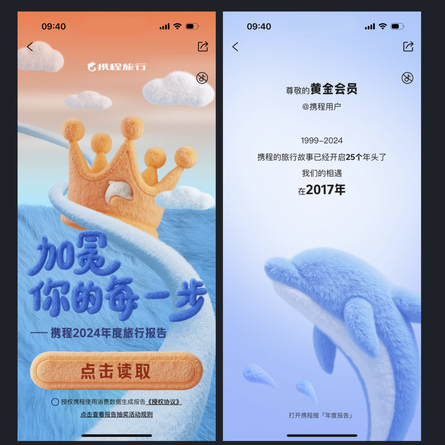 年度報告已成產品標配,但想要讓人印象深刻,風格化表達是關鍵。攜程旅行 2024 年度旅行報告以毛茸茸的設計語言,讓圖標、字體、按鈕都透著柔軟質感,在寒冬中給用戶帶來溫暖體驗。報告不僅呈現出行數據,更通過 "加冕你的每一步" 的情感化文案,讓用戶在回顧旅程時收獲成就感,這種情感與風格的雙重共鳴,讓分享欲自然提升。