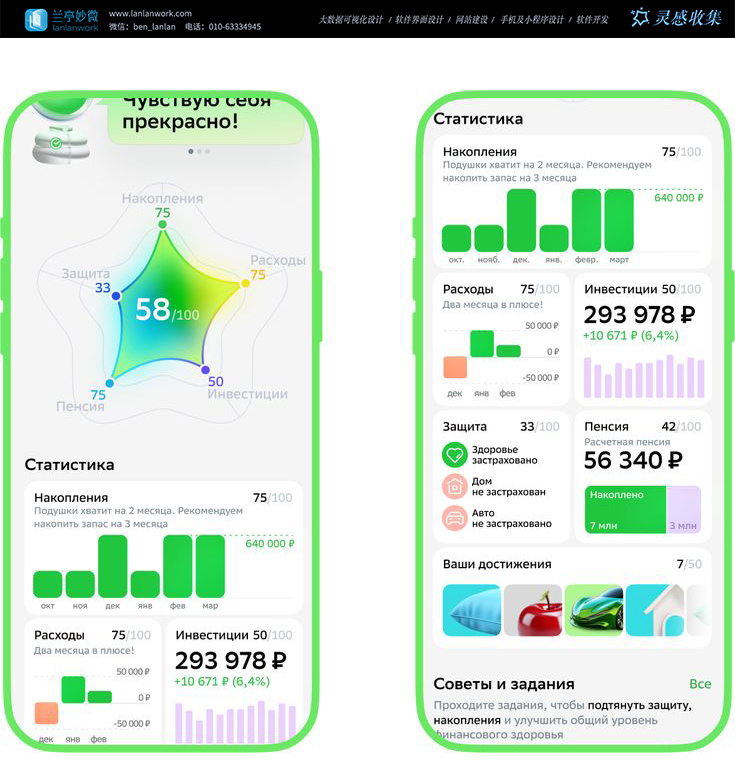 行動引導層:底部的 “Советы и задания”(建議與任務)模塊,將 “提升保險、增加儲蓄” 等理財目標轉化為 “可執行的小任務”,搭配 “你的成就” 可視化激勵,讓用戶從 “被動看數據” 轉向 “主動做改善”,契合俄語區用戶偏好 “明確指令 + 即時反饋” 的交互習慣。