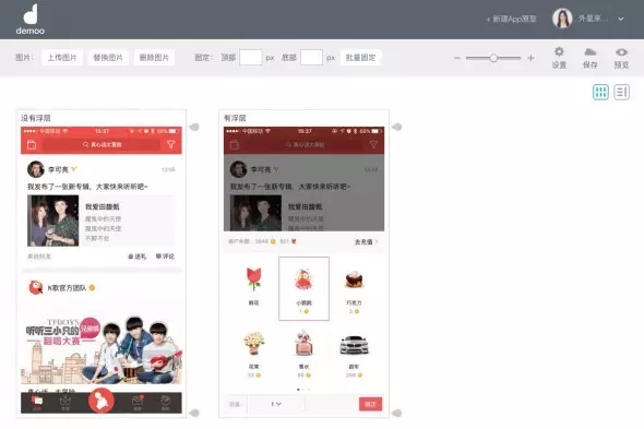 最后,聽說很多試用過的朋友都在詢問,如何在Demoo中模擬浮層的效果,Demoo其實更擅長的是頁面之間的跳轉,那么如何模擬呢?這里給大家一個小技巧。