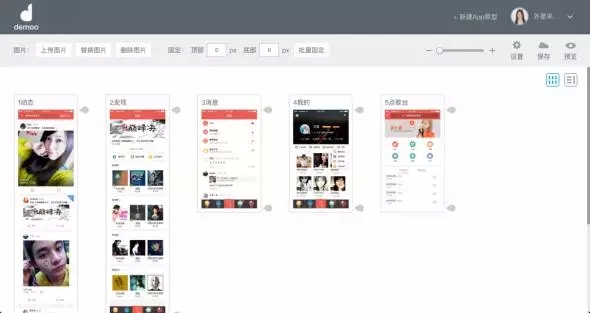 Demoo是基于web設計搭建的一款在瀏覽器內(nèi)進行可視化操作的工具。通過上傳平面稿件,用手勢或觸點熱區(qū)的方式把界面關系連接起來,加入連接轉場,輸出一份仿真APP的、可體驗操作的設計方案,滿足在電腦、會議投影現(xiàn)場及手機上體驗操作。點擊這里可查看更詳細介紹:《為移動端方案設計演示而生的DEMOO》