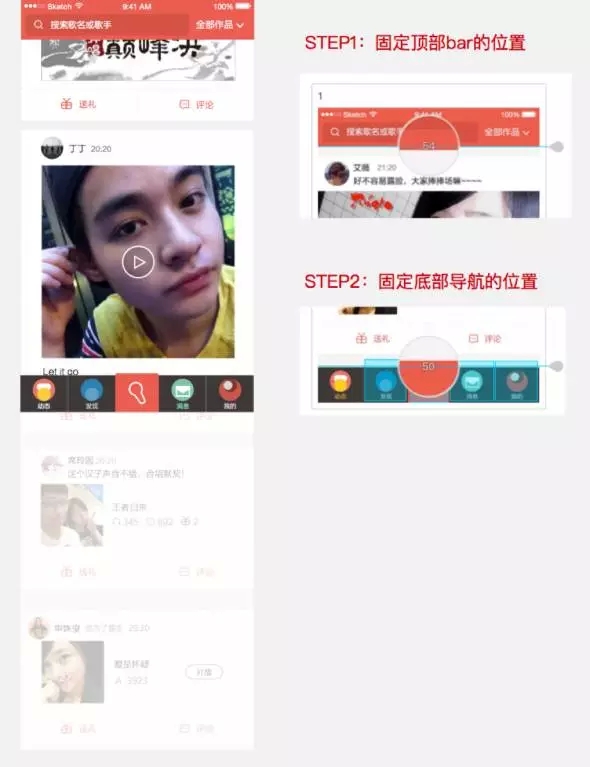 以圖示為例,動態(tài)頁面非常長,需要模擬頁面滾動的效果,實際app中,頂bar和底部導航是不會動的,這時候,只需要拖動上下固定的錨點來固定位置就好了。這里Demoo有一個值得贊美的小細節(jié)是,當你拖動錨點時,會放大顯示頁面中間的位置,并且展示錨點拖動的像素值,所以你只要記住頂bar和底部導航的高度,你一定可以拖到一個完美的位置,沒有白邊。