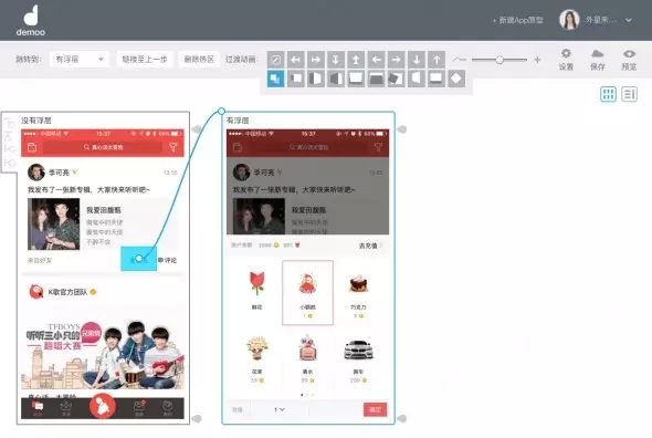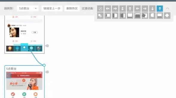 真實的app中,頁面間常常通過方向來示意層級關系,例如重新創(chuàng)建的流程,通常創(chuàng)建頁面會從底部向上呼起,于是,在建立熱區(qū)鏈接過程時,我們需要對鏈接進行方向設定。如圖示,我將點歌臺呼起的頁面出現(xiàn)形式,設定為從下往上出。如果不是很確定切換效果,Demoo很細心的在這里設計了動畫預覽,鼠標停留在小方塊上時,會有微動畫示意,多看幾遍也就明白了。