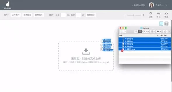 在設計工具中,我已經(jīng)設計好了全民K歌5個主要頁面的圖并命名好保存在文件夾中,準備開始制作原型。如圖所示,Demoo支持批量導入圖片,將我需要的圖片全部選中,拖放到虛框內(nèi),即可完成圖片導入工作。導入后,就相當于你已經(jīng)把app原材料都放到工作臺啦,之后操作起來就會特別方便。