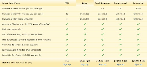 看一下Invoice Machine的例子,表格里除了最上面的三種功能,其他功能的四個條目項都一樣。該表格因此增加了沒有必要的15行。解決方法可以通過一個簡單的公告列表說明“我們的計劃都包括以下功能”,用戶能夠快速看到,他們無論選擇哪個計劃,都會具備這些功能。表格只需要縮短成3-4行,用來顯示不同的部分。我再次重申,表格應該讓信息更易讀。如果您的表格不符合這一目標則會適得其反。
