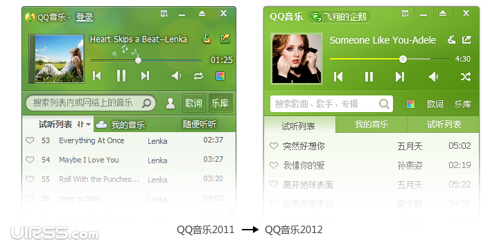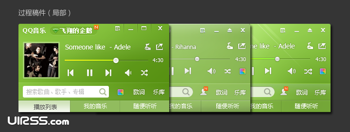 早在2011年7月,QQ音樂2011beta版的發(fā)布便確立了用品牌色–綠色,做為QQ音樂客戶端的默認顏色,綠色代表和平、希望、生長和環(huán)保,對QQ音樂的品牌形象有積極的正面意義,此外,縱觀競品,常見的客戶端配色多為黑和藍,用綠色也較利于提高產(chǎn)品的識別度。QQ音樂2012賀歲版的視覺,也是圍繞綠色和細節(jié)進行全面的體驗優(yōu)化。項目從去年12月31號開始,進行了為期15天的設(shè)計和快速迭代。