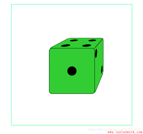 <!DOCTYPE html> <html lang="en"> <head> <meta charset="UTF-8"> <meta name="viewport" content="width=device-width, initial-scale=1.0"> <title>Document</title> <style> *{margin: 0;padding: 0;} ul{list-style: none;} a{text-decoration: none;} img{display: block;} .box1{width: 150px;height: 150px;display: flex;border: 1px black solid;margin: 20px auto;border-radius: 10px;justify-content: center;align-items: center;} .box1 div{width: 30px;height: 30px;border-radius:50%;background: black;} .box2{width: 150px;height: 150px;display: flex;border: 1px black solid;margin: 20px auto;border-radius: 10px;align-items: center;justify-content: space-between;} .box2 div{width: 30px;height: 30px;border-radius:50%;background: black;margin: 10px;} .box2 div:nth-of-type(1){align-self: flex-start;} .box2 div:nth-of-type(2){align-self: flex-end;} .box3{width: 150px;height: 150px;display: flex;border: 1px black solid;margin: 20px auto;border-radius: 10px;align-items: center;justify-content: space-between;} .box3 div{width: 30px;height: 30px;border-radius:50%;background: black;margin: 10px;} .box3 div:nth-of-type(1){align-self: flex-start;} .box3 div:nth-of-type(3){align-self: flex-end;} .box4{width: 150px;height: 150px;border: 1px black solid;margin: 20px auto;border-radius: 10px;display: flex;flex-direction: column;} .box4 div{height: 50%;display: flex;flex-direction: row;justify-content: space-around;align-items: center;} .box4 div li{display: block; width: 30px;height: 30px;border-radius:50%;background: black;} .box5{width: 150px;height: 150px;border: 1px black solid;margin: 20px auto;border-radius: 10px;display: flex;flex-direction: column;} .box5 div{height: 50%;display: flex;flex-direction: row;justify-content: space-around;align-items: center;} .box5 div li{display: block; width: 30px;height: 30px;border-radius:50%;background: black;} .box6{width: 150px;height: 150px;border: 1px black solid;margin: 20px auto;border-radius: 10px;display: flex;flex-direction: column;} .box6 div{height: 50%;display: flex;flex-direction: row;justify-content: space-around;align-items: center;} .box6 div li{display: block; width: 30px;height: 30px;border-radius:50%;background: black;} #box{width: 400px;height: 400px;margin: 20px auto;border: 1px springgreen solid; perspective: 500px;perspective-origin: right top;} #box .main{position: relative;width: 150px;height: 150px;margin: 125px; transform-style: preserve-3d;transition: 4s;transform-origin: center center -50px;} #box .main .box1{position: absolute;background:limegreen;left: 0;top: 0; width: 150px;height: 150px;} #box .main .box2{position: absolute;background:limegreen;left: 0;top: 0; width: 150px;height: 150px;left: 150px;transform-origin:left; transform:rotateY(90deg);} #box .main .box3{position: absolute;background:limegreen;left: 0;top: 0; width: 150px;height: 150px;left: -150px;transform-origin:right; transform:rotateY(-90deg);} #box .main .box4{position: absolute;background:limegreen;left: 0;top: 0; width: 150px;height: 150px;top: -150px;transform-origin:bottom; transform:rotateX(90deg);} #box .main .box5{position: absolute;background:limegreen;left: 0;top: 0; width: 150px;height: 150px;top: 150px;transform-origin:top; transform:rotateX(-90deg);} #box .main .box6{position: absolute;background:limegreen;left: 0;top: 0; width: 150px;height: 150px;transform:translateZ(-150px) rotateY(180deg);} #box:hover .main{transform:rotateY(360deg);} </style> </head> <body> <div id="box"> <div class="main"> <div class="box1"> <div></div> </div> <div class="box2"> <div></div> <div></div> </div> <div class="box3"> <div></div> <div></div> <div></div> </div> <div class="box4"> <div> <li></li> <li></li> </div> <div> <li></li> <li></li> </div> </div> <div class="box5"> <div> <li></li> <li></li> </div> <div> <li></li> </div> <div> <li></li> <li></li> </div> </div> <div class="box6"> <div> <li></li> <li></li> </div> <div> <li></li> <li></li> </div> <div> <li></li> <li></li> </div> </div> </div> </div> </body> </html>實際效果:![]()