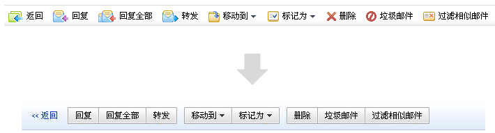 上面的是我們外貿郵界面目前的狀態(tài),所有的操作都并列擺放,隨著功能的增多,用戶識別的效率大大降低,優(yōu)化的方案是將相關的操作進行分組,正是運用關聯和并列的信息關系進行設計