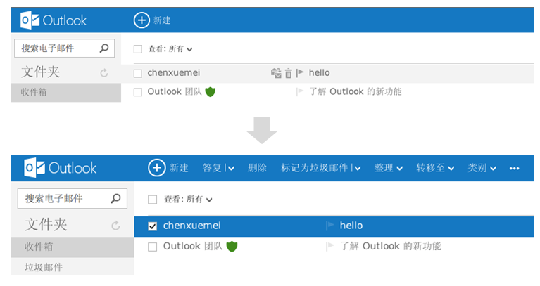 Outlook郵件網頁界面,默認情況下對郵件的操作入口都是隱藏的,只有當用戶選擇了郵件之后,才會出現對郵件的操作,同時不常用的操作也會被隱藏到下拉菜單中,如“答復”菜單下隱藏的“全部答復、轉發(fā)”,這種隱藏非核心內容的處理方式,能讓用戶更集中于他可關注的信息和主要操作