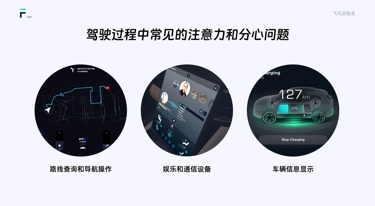 在駕駛過程中,有一些常見的注意力和分心問題需要我們關(guān)注和解決。路線查詢和導(dǎo)航操作:駕駛員需要查看導(dǎo)航系統(tǒng)、調(diào)整路線和尋找目的地等操作,這可能轉(zhuǎn)移駕駛員的注意力,導(dǎo)致駕駛員對道路情況的關(guān)注度下降。娛樂和通信設(shè)備:駕駛員使用娛樂系統(tǒng)或通信設(shè)備進(jìn)行音樂播放、電話通話或信息發(fā)送等操作,這會分散駕駛員的注意力,增加駕駛風(fēng)險。車輛信息顯示:車輛上的信息顯示系統(tǒng)可能包含大量的信息,如車速、油耗、車輛故障等,駕駛員需要分散注意力去獲取和理解這些信息,這可能影響駕駛員對道路情況的感知和對緊急情況的反應(yīng)能力。了解駕駛員的注意力和分心因素對于優(yōu)化車載界面設(shè)計(jì)至關(guān)重要。那么我們?nèi)绾螏椭{駛員保持集中注意力,并減少分心情況的發(fā)生。