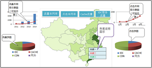 在分省概況模塊里有四個小的模塊。分別是流量本網率、點擊本網率、Cache流量、IDC服務流量。